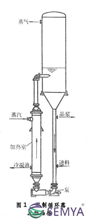 強(qiáng)制循環(huán)蒸發(fā)結(jié)晶器 一種晶漿循環(huán)式連續(xù)結(jié)晶器(圖1)。操作時,料液自循環(huán)管下部加入,與離開結(jié)晶室底部的晶漿混合后,由泵送往加熱室。晶漿在加熱室內(nèi)升溫(通常為2~6℃),但不發(fā)生蒸發(fā)。熱晶漿進(jìn)入結(jié)晶室后沸騰,使溶液達(dá)到過飽和狀態(tài),于是部分溶質(zhì)沉積在懸浮晶粒表面上,使晶體長大。作為產(chǎn)品的晶漿從循環(huán)管上部排出。強(qiáng)制循環(huán)蒸發(fā)結(jié)晶器生產(chǎn)能力大,但產(chǎn)品的粒度分布較寬。