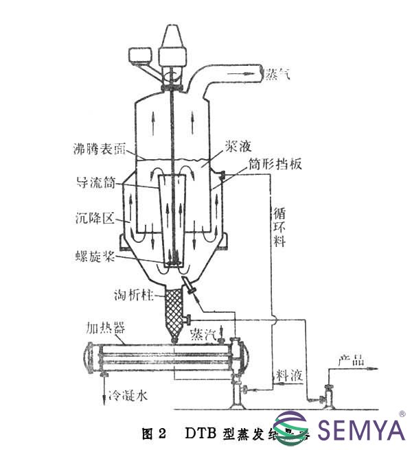 DTB型蒸發(fā)結(jié)晶器 即導(dǎo)流筒-擋板蒸發(fā)結(jié)晶器,也是一種晶漿循環(huán)式結(jié)晶器(見彩圖)。器下部接有淘析柱,器內(nèi)設(shè)有導(dǎo)流筒和筒形擋板,操作時熱飽和料液連續(xù)加到循環(huán)管下部,與循環(huán)管內(nèi)夾帶有小晶體的母液混合后泵送至加熱器。加熱后的溶液在導(dǎo)流筒底部附近流入結(jié)晶器,并由緩慢轉(zhuǎn)動的螺旋槳沿導(dǎo)流筒送至液面。溶液在液面蒸發(fā)冷卻,達(dá)過飽和狀態(tài),其中部分溶質(zhì)在懸浮的顆粒表面沉積,使晶體長大。在環(huán)形擋板外圍還有一個沉降區(qū)。在沉降區(qū)內(nèi)大顆粒沉降,而小顆粒則隨母液入循環(huán)管并受熱溶解。晶體于結(jié)晶器底部入淘析柱。為使結(jié)晶產(chǎn)品的粒度盡量均勻,將沉降區(qū)來的部分母液加到淘析柱底部,利用水力分級的作用,使小顆粒隨液流返回結(jié)晶器,而結(jié)晶產(chǎn)品從淘析柱下部卸出(圖2)。