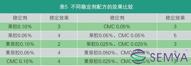 通過感官打分,比較出穩(wěn)定性最好的穩(wěn)定劑配方為:果膠0.05%,CMC 0.05%(均為質量分數(shù))。
